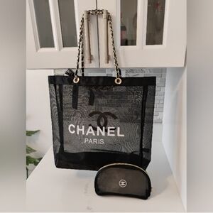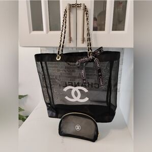 NEW Classic Luxury Black Mesh Tote with Gold Chain Handles and Cosmetic Pouch