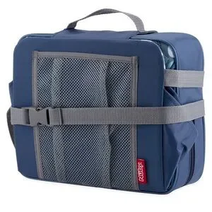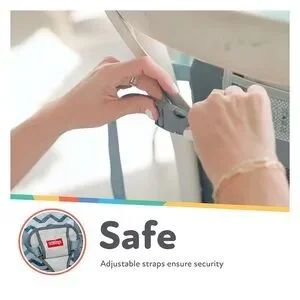 Nuby booster seat with a blue and gray pattern. Features secure straps for safety.