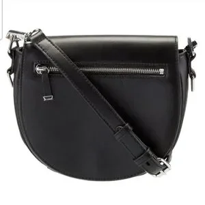 This sophisticated crossbody bag by Rebecca Minkoff features a sleek black leather exterior and striking silver-tone hardware. Its compact, semicircular design offers a modern aesthetic, making it a versatile accessory for any occasion.