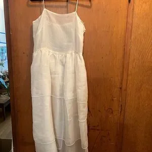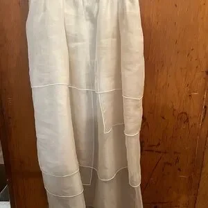 Midi length dress from delicate ivory silk organza. Self lined bodice with straight cut neckline, dress hits at natural waist and opens into a full skirt of lightly gathered tiered panels of silk organza. White pearl edge finish on each tier. Thin corded straps tie at each shoulder.