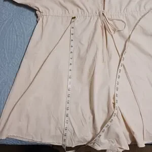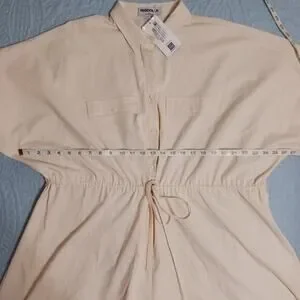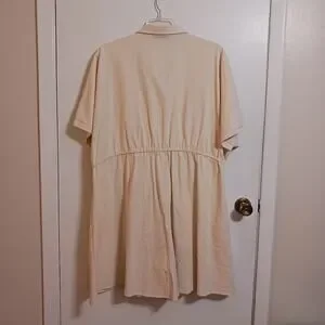 New with tags romper. Drawstring waist, button top, zip front shorts. Casual style but could also be dressed up. Cool lightweight blend of fabrics. Size 2X. Because it is a linen blend there are a few discolored threads. These are just natural in the fabric and are not stains or marks that wash out. Approximate flat lay measurements shown in photos.