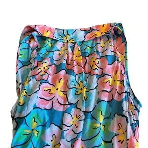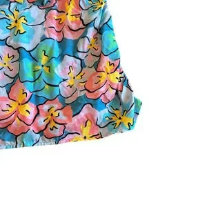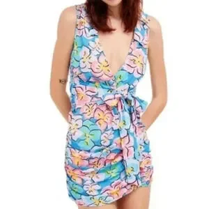 Lightweight, vibrant tropical-inspired mini dress featuring a deep V-neck, waist tie for a cinched fit, and ruched sides for a super flattering silhouette.