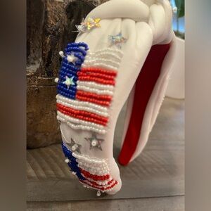 Stylish headband with red, white, and blue beads and sparkly silver stars forming American flags on the sides. Perfect for 4th of July parties or celebrations.