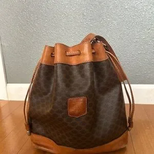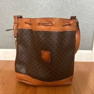 Celine brown leather bucket bag. Definitely beat up (price reflects). However- I love the worn in look. I added an extra hole at the strap to make it slightly shorter.