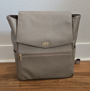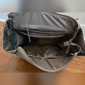 Excellent like new condition. Very rarely used. No scratches or stains on inside or outside of bag except small one on strap as pictured (not very noticeable, may be able to clean). 4 outside pockets (one has zipper) 6 inside pockets (one zipper and one insulated. Zip and snap closure. Adjustable straps. Comes with matching foldable changing pad inside.
