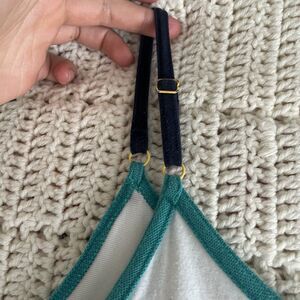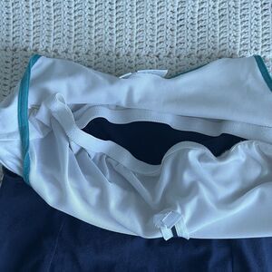 Two-tone white and blue cotton tennis dress with tennis ball zipper, teal and yellow trim detail, built-in bra