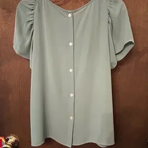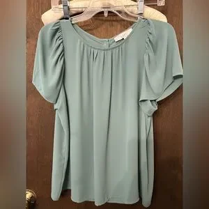 Women’s top by Loft. Medium with short sleeves and button down back, so cute. 100% polyester. The 2nd picture is the closest to the actual color.