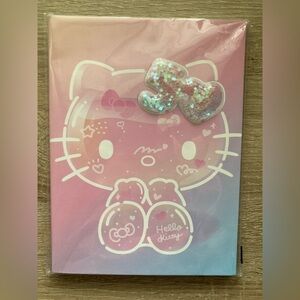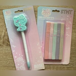 Four piece bundle of Hello Kitty 50th anniversary stationery items. Includes pen, set of highlighters, pencil case, and notebook with 3D glitter decoration. Notebook has lined pages. Very cute and fun.