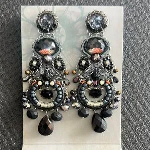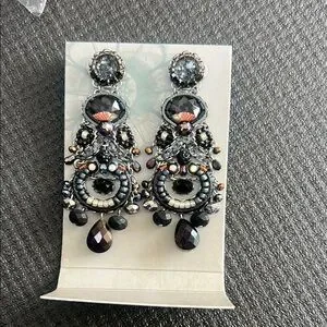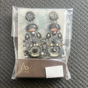 Elegant Ayala Bar statement earrings in black and silver with a little blue accent. Intricate design with sparkling details. Like new. Still in original packaging.
