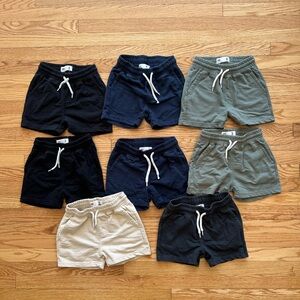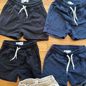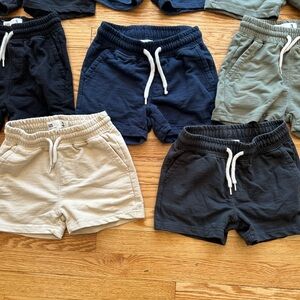 Casual Comfortable and stylish kids' shorts set in black, blue, green, and tan. Perfect for everyday wear. These shorts have been worn has natural wear and tear but overall in good condition.