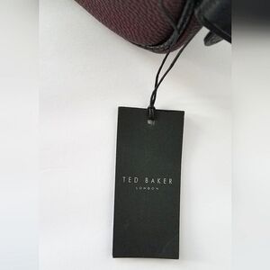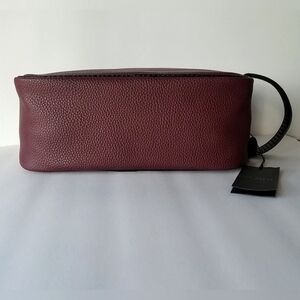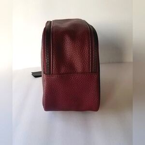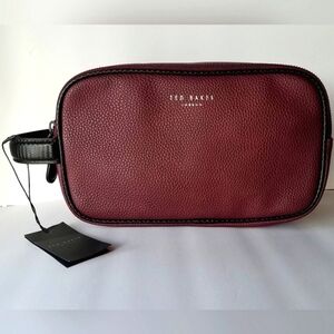 A toiletry bag that packs your essentials to stay organized for travel or home from Ted Baker London. This bag features a double zip compartment and easy grip handle. Lined. Color Dark Red. Black trim. Separate double zip compartments. Single grip handle. Approx 6" H x 10" L x 4" D. New with tags.