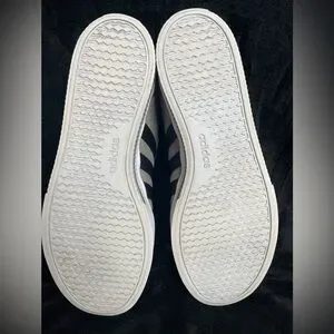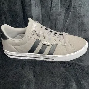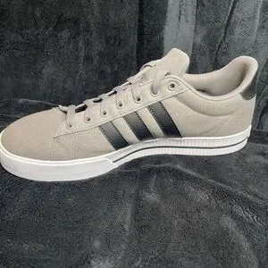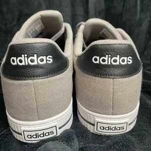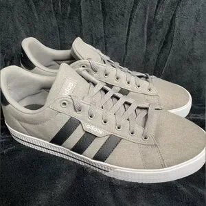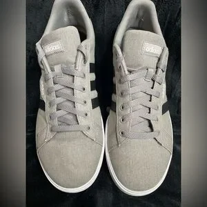 Stylish adidas sneakers. Gray canvas upper. Black stripes. Comfortable fit.