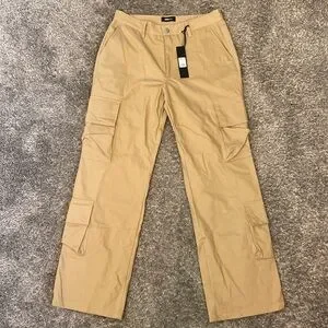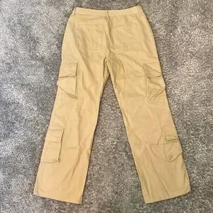 Stylish tan cargo pants. Multiple pockets. Comfortable fit. Perfect for casual wear.