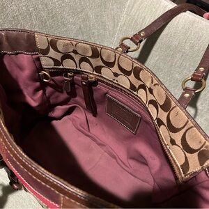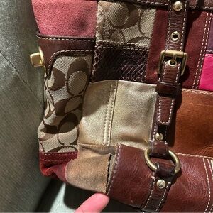 This Coach tote bag has a patchwork style design, with suede and leather squares containing nj various designing. Crafted from premium materials, this tote features a spacious interior and sturdy double handles, making it ideal for everyday use. Its striking color combination and elegant design ensure it stands out in any setting! Check photos for any imperfections.