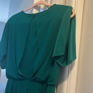 This Vince Camuto jumpsuit in a rich green hue features a relaxed silhouette with short sleeves and a wide-leg design. The elastic waist adds comfort, while the soft, drapey fabric ensures a polished yet casual look. Preloved