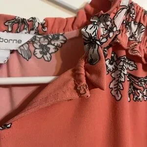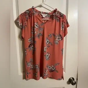 This stylish floral top features a vibrant coral color, perfect for any occasion. In like new condition. It is size small, but seems to run slightly larger.