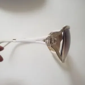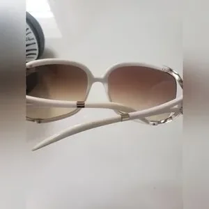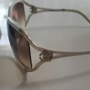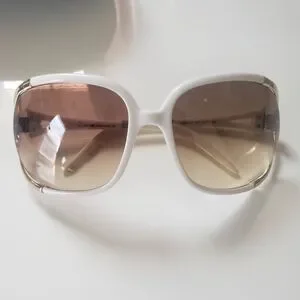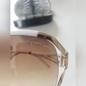 Rare color Roberto Cavalli white/brown gradient oversized sunglasses with side cut out design (Talisia 370S). Gold accents and crystal embellished logos on side profile makes these stand out. Lightweight and crafted in Italy.