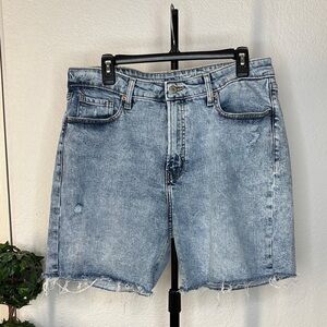 Stylish blue jean shorts. Frayed hem for a casual look. Classic five-pocket design. Perfect for everyday wear. Cut-offs made from the High-Rise O.G. Straight Jeans.