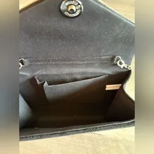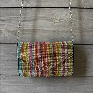 Elevate your style with this vibrant rhinestone rainbow striped crossbody. Crossbody strap is a silver colored chain that can is detachable and purse can be used as a clutch too! Perfect for adding a splash of color to any outfit.