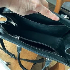Elegant black crossbody with silver accents. Removable strap for a shoulder bag conversion. The sides zipped down for additional room. Stylish and functional. Ideal for everyday use.