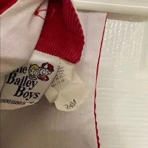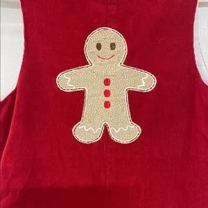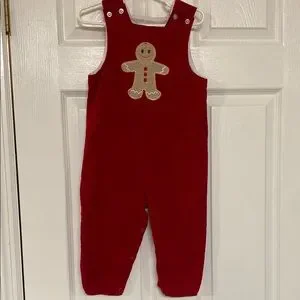 Adorable red overalls featuring a cute gingerbread design. Perfect for festive occasions and everyday wear.