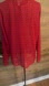 red, long-sleeved button-down shirt with a subtle polka dot pattern. It has a mandarin collar and a slightly sheer fabric. To wear it, consider the occasion and your personal style. For a casual look, pair it with jeans or shorts. For a more dressed-up look, try wearing it with a skirt or trousers. The sheerness of the fabric suggests that it could be worn over a camisole or tank top for added coverage.