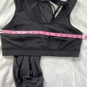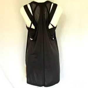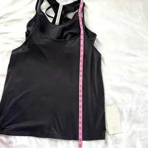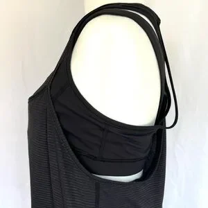 This Lululemon Athletica black striped Tough It Out Tank Top is a Size 10. The New with Tags tank is hip length with a loose fit. This tank top has an attached solid black sports bra that is intended to provide medium support for a B/C cup. The special breathable fabric of the tank top is perfect for hot workouts. As the tag explains (see photo), the Luxtreme fabric bra is sweat-wicking and has a four-way stretch with mesh fabric panels that let off steam. Please see photos for fabric details and measurements.