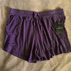 Purple polyester, cotton, spandex, cuddle duds, laying lounging sleeping shorts with pockets. Ribbon tie around and elastic waist that generously stretches to fit your form. Waist will go from 34 inches to 44 inches depending on your preferred fit. Nice front slash 8” pockets brand new with tags. Received as a gift but it is not my size.
