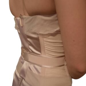 The silk top features an impeccably constructed boned corset. Body hugging with stretch to create a sculpted smooth silhoutte. Monochromatic aesthetic with tonal & textural variations add to it's edginess. Grossgrain ribbon & tulle are strategically placed to accentuate the natural lines of the body. The waist is further defined by the attached satin belt that secures with hook closure at the back. The built in strapless bra is very supportive. It hugs the body to fit most breast sizes. Rear zip closure.