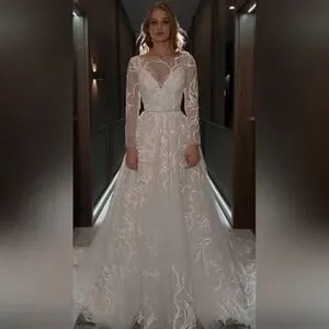 This 2 in 1 Stourin Wedding Gown is looking for a new Princess Bride. If you want more than one look for your wedding, this is the one! The beautifully detailed overlay is a sheer tulle gown with amazingly sparkly and light-reflective glitter details extending throughout the sleeves and the train. The branch-like pattern lends itself to a perfectly whimsical, forest, fairytale wedding. ✨️