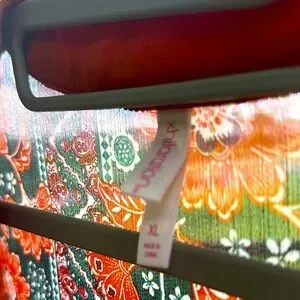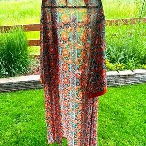 Stunning green and orange floral print for this kimono. Sheer lightweight fabric and flowy wide sleeve. Orange trim around the collar. Duster length (mid calf on 5’6 body). In like new condition with no callouts. No returns, all sales final. Reasonable offers welcome! 2 day shipping or faster 🦋