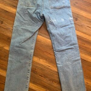 The Wrangler Men's 32x34 Blue Wash Regular Fit Jeans are a classic and versatile addition to any western-themed wardrobe. Made of durable cotton denim with a light fabric wash, these jeans feature a zip closure, belt loops, and a 5-pocket design. The distressed accents add a touch of rustic charm, while the straight leg silhouette and regular fit offer comfort and style. With a vintage cowboy theme and the trusted Wrangler brand, these jeans are perfect for year-round wear in any season. These jeans are faded, wore in, have some fade marks on the back, please see photos for condition. Experience timeless style with Wrangler's blue straight jeans, crafted for a classic look. These jeans offer a versatile fit, perfect for any casual occasion, ensuring both comfort and durability.