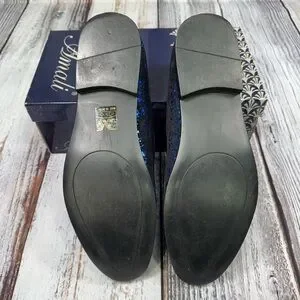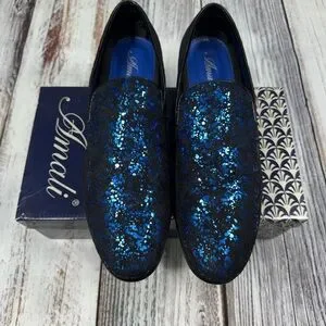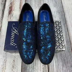 Step into elegance with Amali’s slip-on loafers, showcasing a stunning blue sparkle design against a sleek black base. These shoes offer a perfect blend of classic style and modern flair, making them ideal for formal occasions. The black trim and sole add a touch of sophistication to this eye-catching pair.