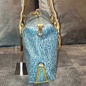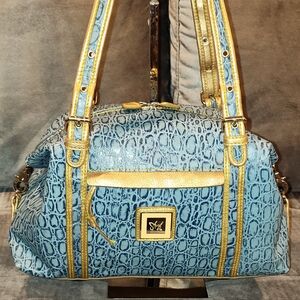 Elegant blue shoulder bag with gold accents. Embossed texture adds sophistication. Ideal for stylish outings.