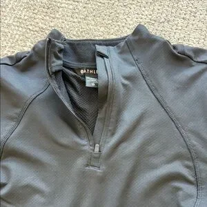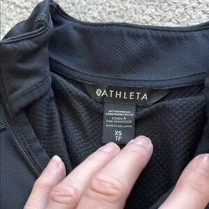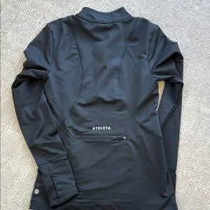 Experience modern minimalism with the Athleta black 1/4 zip, featuring a fitted design and long sleeves. The mandarin collar adds a touch of sophistication, while the smooth, structured fabric ensures a sleek silhouette. Perfect for a contemporary look, this top is a versatile addition to any wardrobe. Hard to photograph black but this has absolutely no fade. I’m not sure my daughter ever wore this.