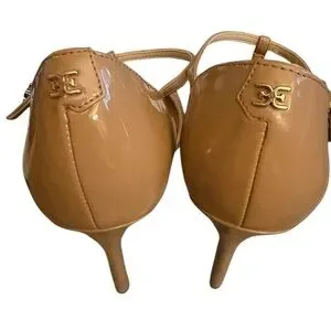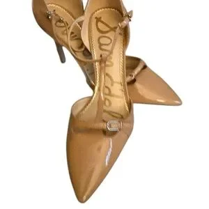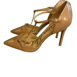 Sam Edelman brand women's shoes, specifically high-heeled pumps with a T-strap design. They feature a pointed toe and a buckle closure, and the image shows nude patent leather finish. Size 8.5 4” heels