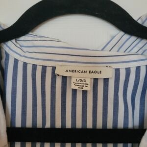This casual sundress from American Eagle Outfitters features a charming blue and white color scheme with a notched collar and 3/4 cuffed sleeves. The dress is designed with a fitted waist and a flared skirt, offering a comfortable yet stylish look for work or casual outings.