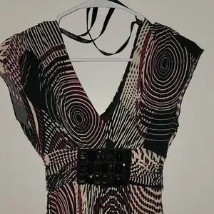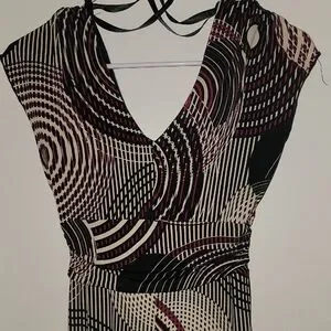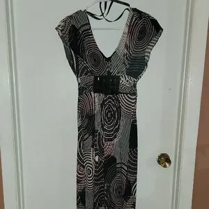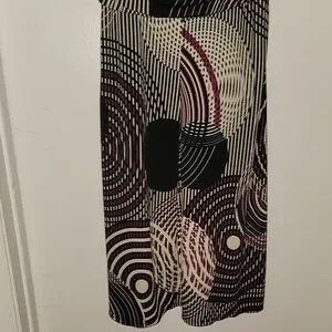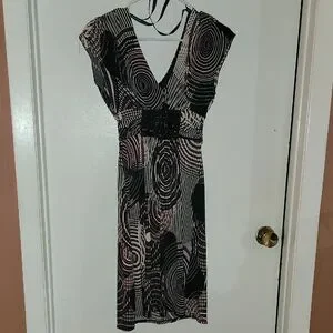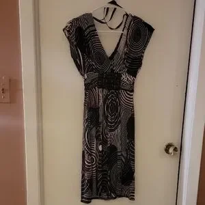 This Bisou Bisou dress features a striking black and white abstract pattern, perfect for a cocktail night out. The sheath style is complemented by a V-neckline and flutter cap sleeves, offering a sophisticated and modern look. Its midi length and cinched waist create a flattering silhouette, making it a versatile addition to your wardrobe.