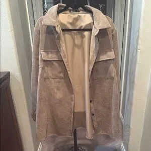 Stylish tan corduroy jacket with button details. Perfect for layering.