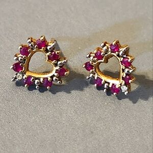 10K YELLOW GOLD Pink Sapphire & Diamond Heart Stud Earrings