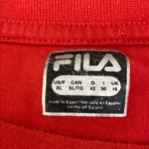 Vibrant red Fila tee with bold logo. Features black and white striped sleeves. Ideal for everyday style. Size reports as XL. It is more like a Large. Ptp is 17 flat and 20 stretched. Nice condition.