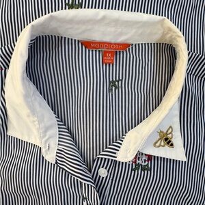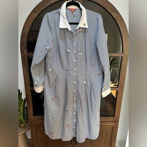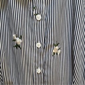 This elegant striped blue shirt dress features delicate floral embroidery, perfect for any occasion. The classic design offers a sophisticated look with a modern twist.