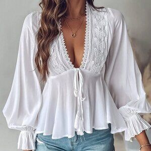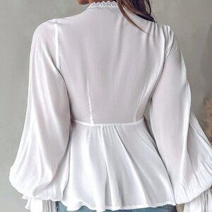 White Sexy Women's Contrast Lace Long Lantern Sleeve Blouse Peplum Top
