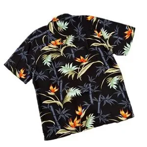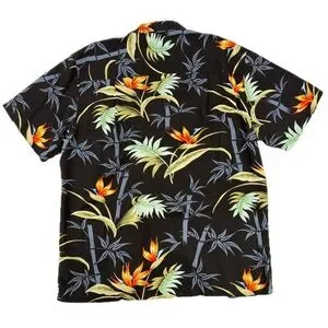 This classy Bamboo Paradise in black men's Hawaiian shirt is made of 100% rayon and has a matched pocket and real wood buttons.