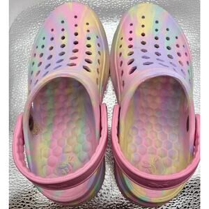 The Joybees Kids Clogs Active Shoes in little girl's size 12-13 are fun and stylish slipper-style shoes perfect for active young girls. With a low top design, round toe shape, and pull-on closure, these shoes are easy to wear and comfortable for everyday use. The tie-dye pattern in pink adds a colorful and trendy touch, while the rubber outsole provides durability and support for walking, beach trips, and school activities. The cushioned foam ensures a lightweight and comfortable fit, making these shoes a great choice for summer, fall, and spring seasons.