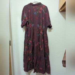 This casual sundress features a vibrant red hue with a buttoned front and a tiered skirt. The 3/4 cuffed sleeves and polo collar add a touch of sophistication to its relaxed silhouette, making it perfect for everyday wear.