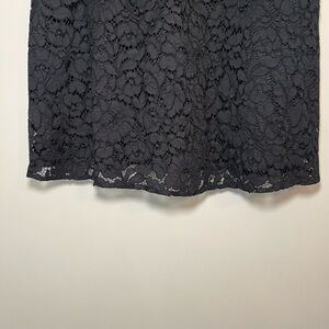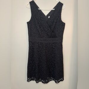 This chic black mini dress by LOFT features a sleeveless design with a flattering V-neckline. The A-line silhouette is crafted from delicate floral lace, offering a romantic touch perfect for cocktail events. Its fitted bodice and slightly flared skirt create an elegant and timeless look.