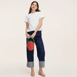 Part of the Kate Spade x Target collaboration! Charming strawberry-shaped wicker handbag. Features a vibrant red body with green handle. Adorned with pearl accents.