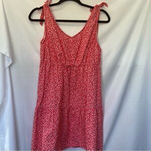 Charming mini dress with floral pattern. Sleeveless with tie straps. Perfect for casual outings.