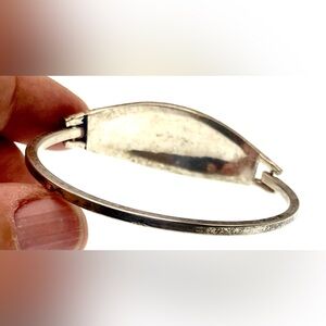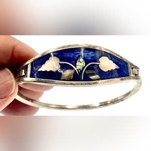 Vintage Signed Alpaca Mexico Silver Blue Enamel Inlaid Abalone and Mother of Pearl Leaf Design Bangle Bracelet. Very pretty bracelet with inlaid abalone and mother of pearl. Secure closure. Minor surface scratches due to age but still very shiny. In great condition. Inside dimensions 2 3/8” x 1 3/4".